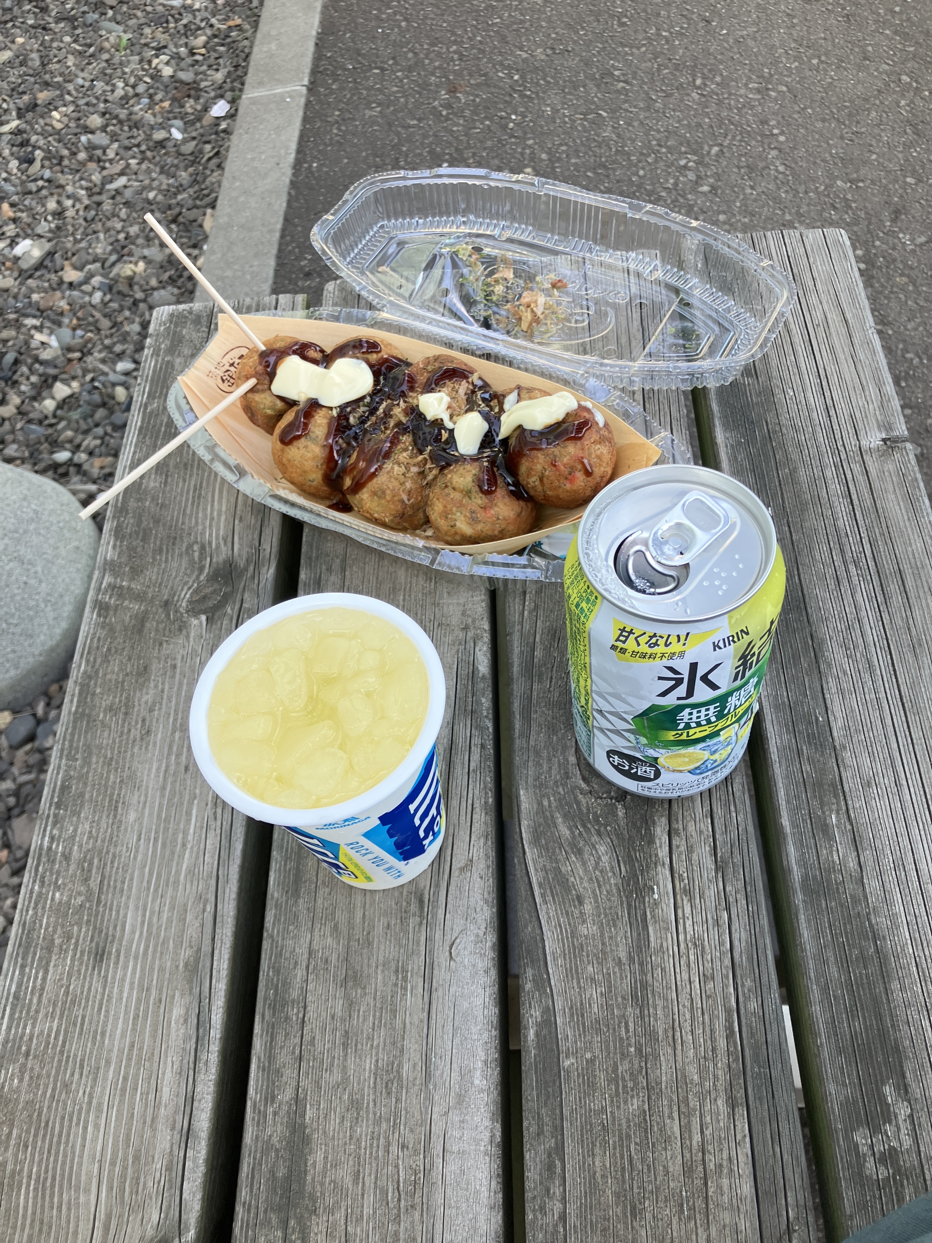 昼間から縁側で飲むお酒とたこ焼き。