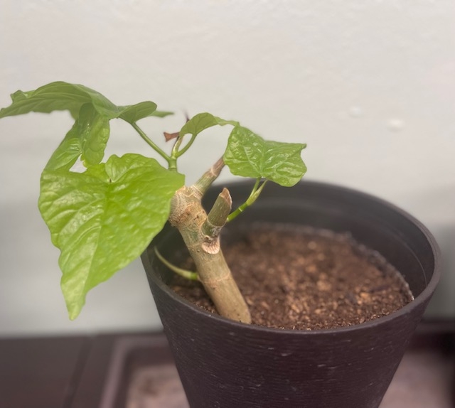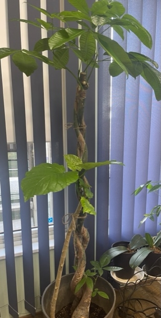 間引きして倒れそうなパキラを支える為に、間引きして捨てたウンベラータの木を支えに使ったら、葉が出てきた。