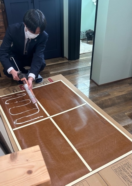 池田君と羽野君に貼り付けとコーキングをしてもらいました~。