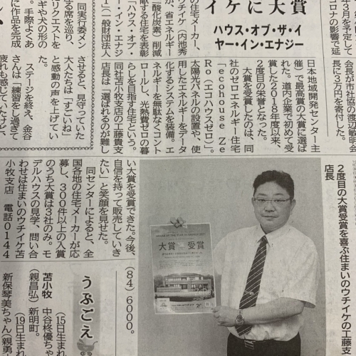 ハウス・オブ・ザ・イヤー・イン・エナジー大賞受賞!! 2022.04.02 工藤 貴 お元気ですかぁ~? 苫小牧民報に3月29日記事が掲載されました・・・。恥ずかしい・・・です。 3月30日には当社受賞広告が一面に!!! 新聞記事に書いている通り・・・ なんと!! ハウス・オブ・ザ・イヤー・イン・エナジー2021 ‘大賞’受賞しました!! 2018年以来 なんと!! 二度目の受賞になりますよ!! 2018年 北海道初!! 大賞受賞。 2021年 北海道初!! 2回目の大賞受賞!! 2018年は、当社標準住宅 ’エコハウス’にて受賞し、 2021年は、当社 ’エコハウス・ゼロ’にての大賞受賞!! なので!! 当社が建てている全ての住宅が!!なんと!! ‘ハウス・オブ・ザ・イヤー・イン・エナジー’大賞受賞住宅になりました!! 本当にすごいことなんですよ!! 認められているんです!! 全国区で!! もう、お客様はじめたくさんの方に ‘感謝’します!! 全国大賞受賞の住宅会社が、苫小牧市にあります!! あるんですよ!! 北海道に!! 今後も、たくさんのお客様に当社の事をお伝えできるように頑張りますね。 みんさんの応援も、今まで以上お願い致します!!!!! また、今回大賞受賞に関したくさんのお祝いのお言葉本当にありがとうございます!! 私たち、住まいのウチイケ。 更なる飛躍に向け、日々努力し続けます!! 期待してくださいね!! 住まいのウチイケ 工藤でした。 — — — — — — — — — — — — — — — — — — — — — — 室蘭、登別、伊達、苫小牧の新築・注文住宅は住まいのウチイケ。省エネルギー性能の優れた住宅を提供、リフォームも対応しています。モデルハウスも常時見学可能ですのでお気軽にどうぞ。 住まいのウチイケ http://www.uchiike-home.co.jp 工藤 貴 左 苫小牧ブログ お知らせ 右