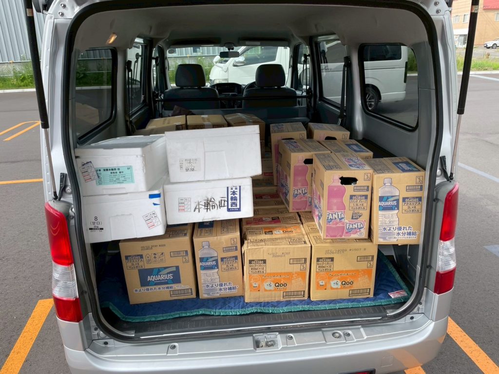 24時間のスーパーなので、事前に飲み物を発注・清算しておいて、できるだけ冷やしておいてもらった状態で当日の朝に受け取りです。
