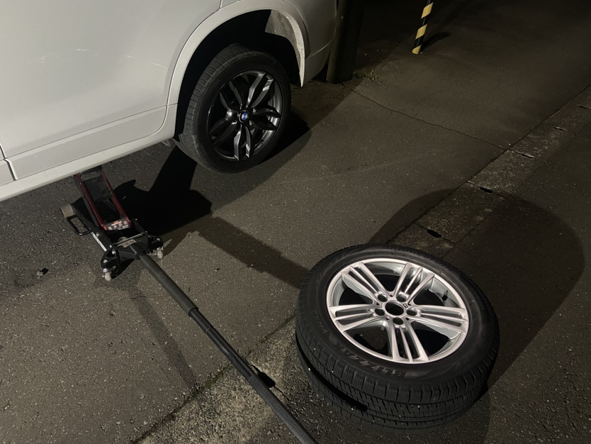 暗くなってしまいましたが、夜にタイヤ交換。