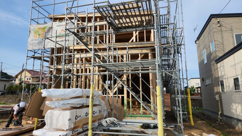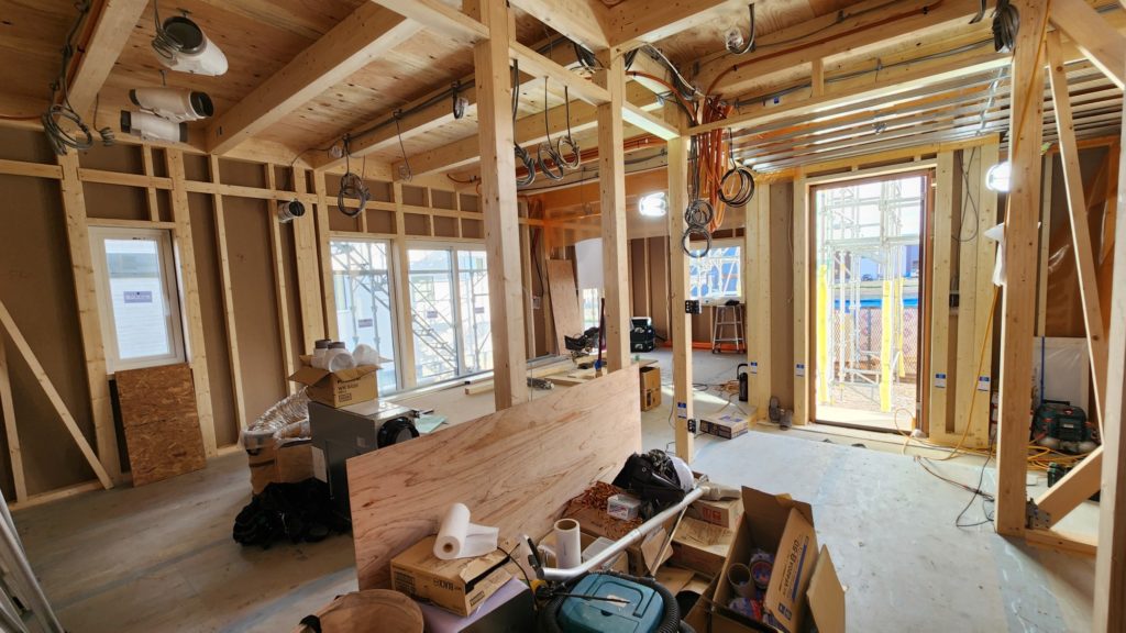 建方が終わり、壁とサッシが入り2週間ほどで家の形になります。