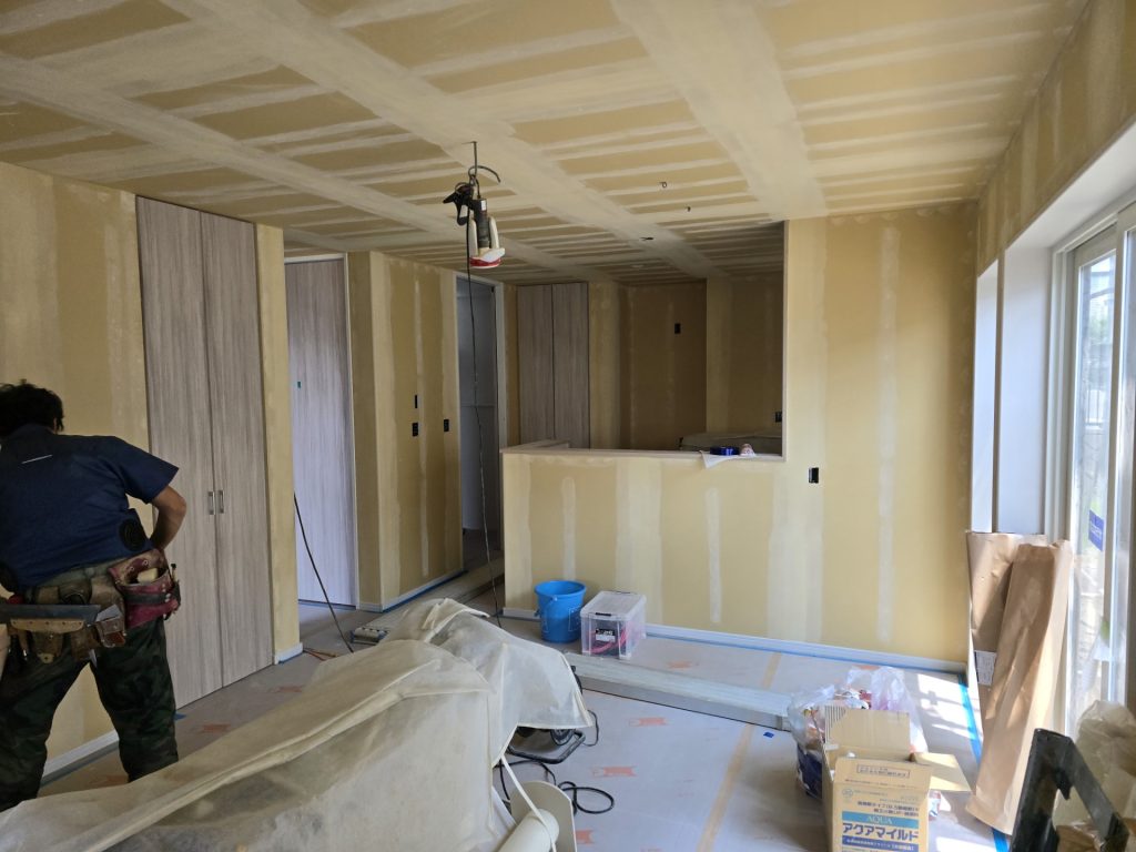 クロス張り工事がはじまります。写真はクロスを張る前の下地を整えているところです。