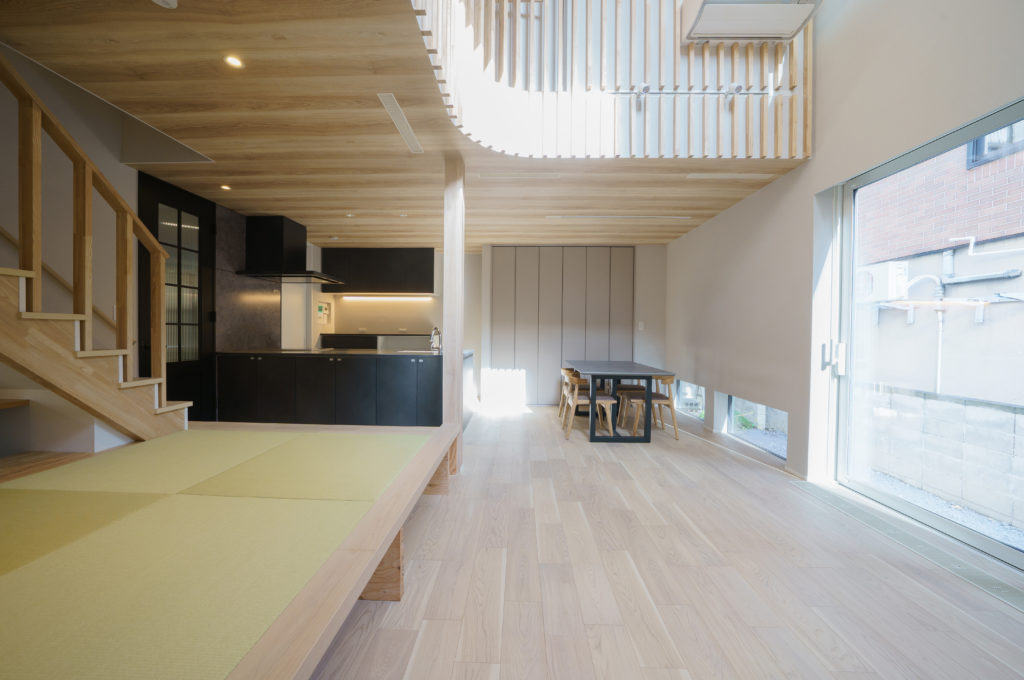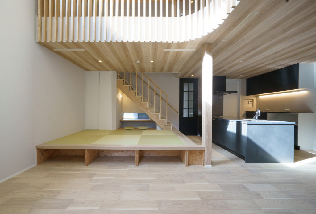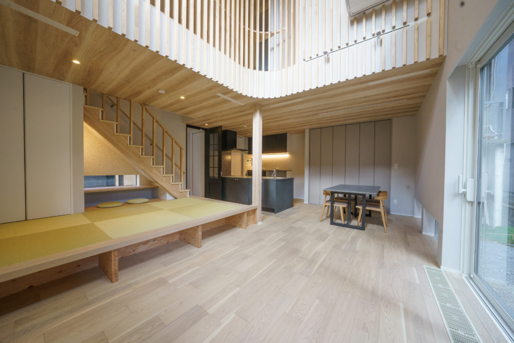 狭小地に建つ2階建ての住まいは、吹き抜けと2方向の大開口から光を取り込み、外からの視線を遮りながら明るく開放的に暮らせます。小上がり和室には掘りごたつ形状のカウンターを設け、リモートワークにも最適。収納も備え、空間を有効活用しています。南側の窓とミニドッグランからは家事をしながら愛犬を眺められる癒しの時間を。さらに高気密高断熱+全館空調で、一年中快適かつ省エネな暮らしを実現します。デザイン性と高水準の断熱性能を両立させる住まいのウチイケだからこそ実現できる、心躍る毎日と家族の絆を深める特別な住まいを、ぜひご体感ください。
